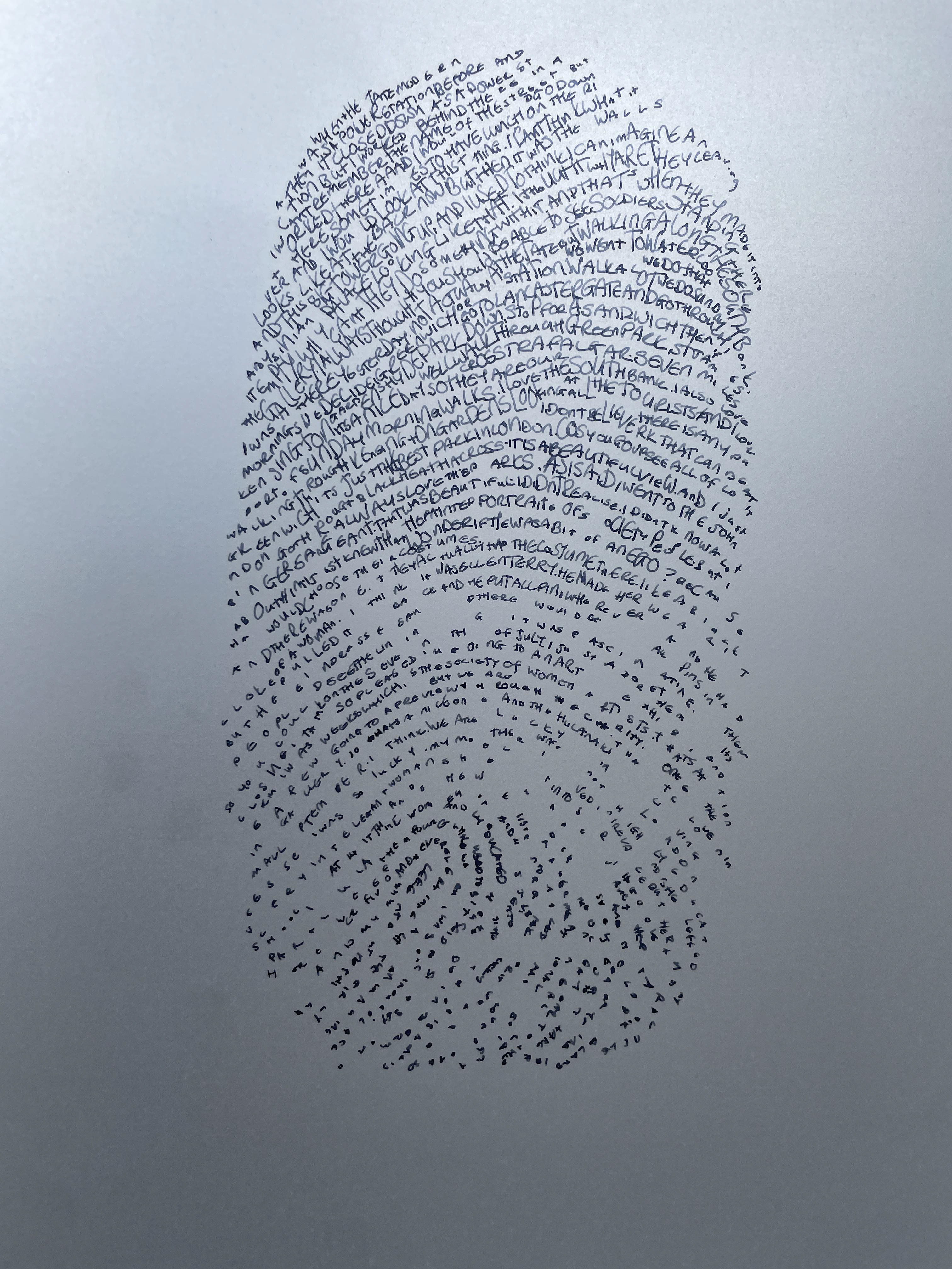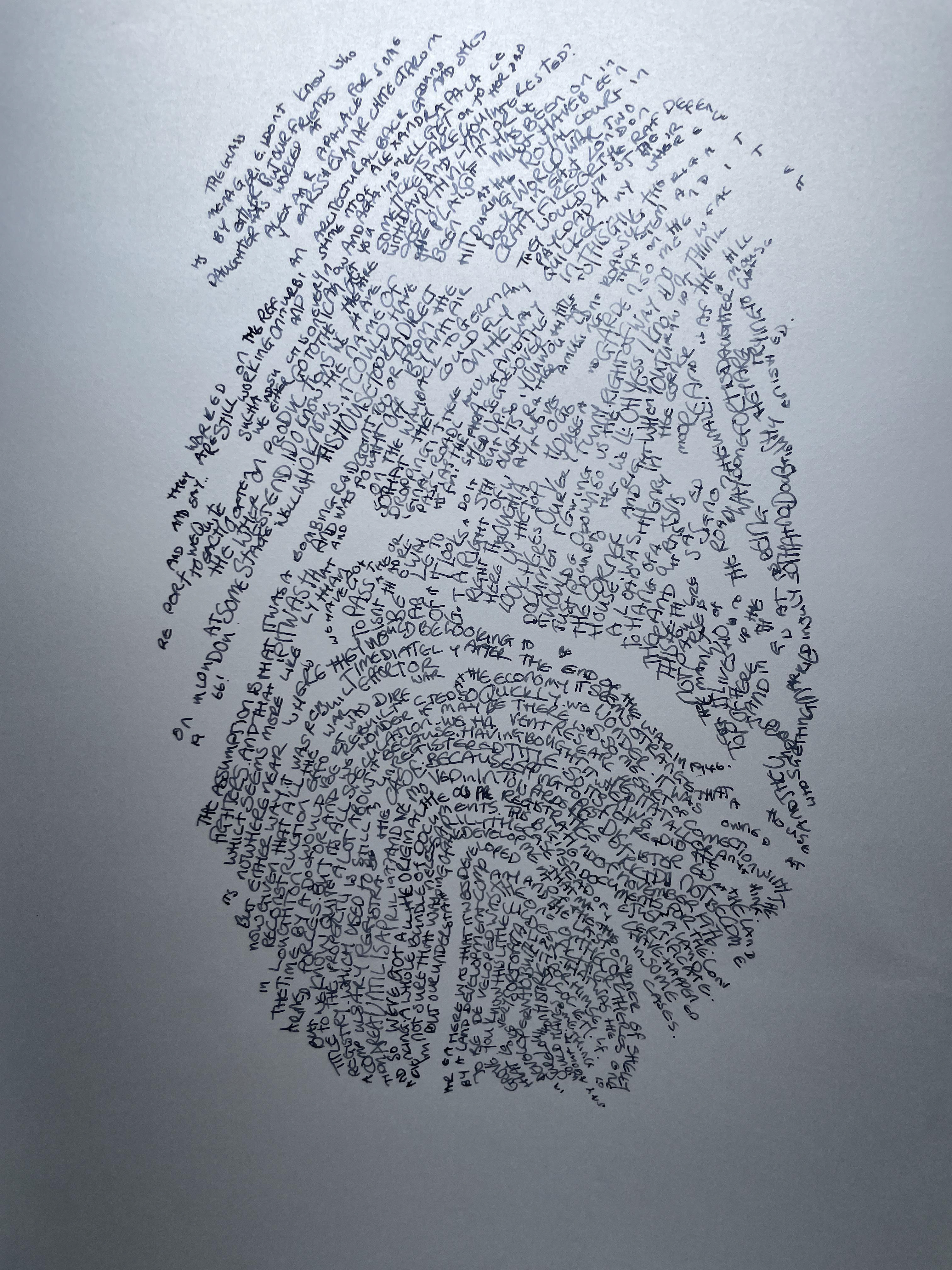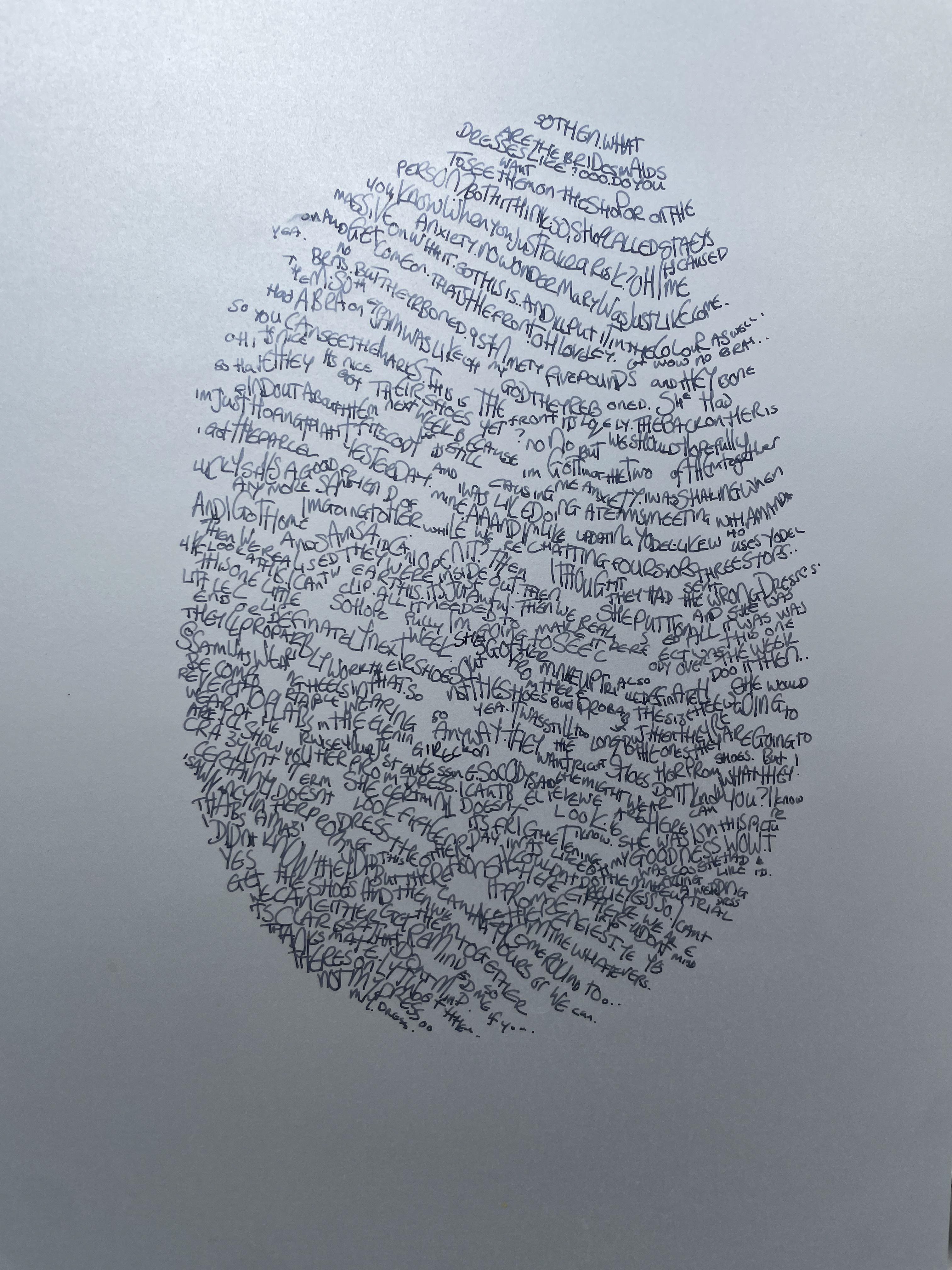 'Duologues' is a series of portraits of conversations between myself and other people. Some I know very well; some I have never met before. The index for me is my handwriting and the index for the other person is the pattern of their fingerprint. Each is unique.The interaction is depicted in the words of the conversation. They were recorded in the moment and transcribed later. They range in subject from holiday plans to one woman's life's work. They have no set starting point and are natural and flowing.They are purposefully unframed and drawn on tracing paper reflecting the fleeting connection between two people.The six drawings here are part of an ongoing series, if you would like to create a Duologue with me please do get in touch.