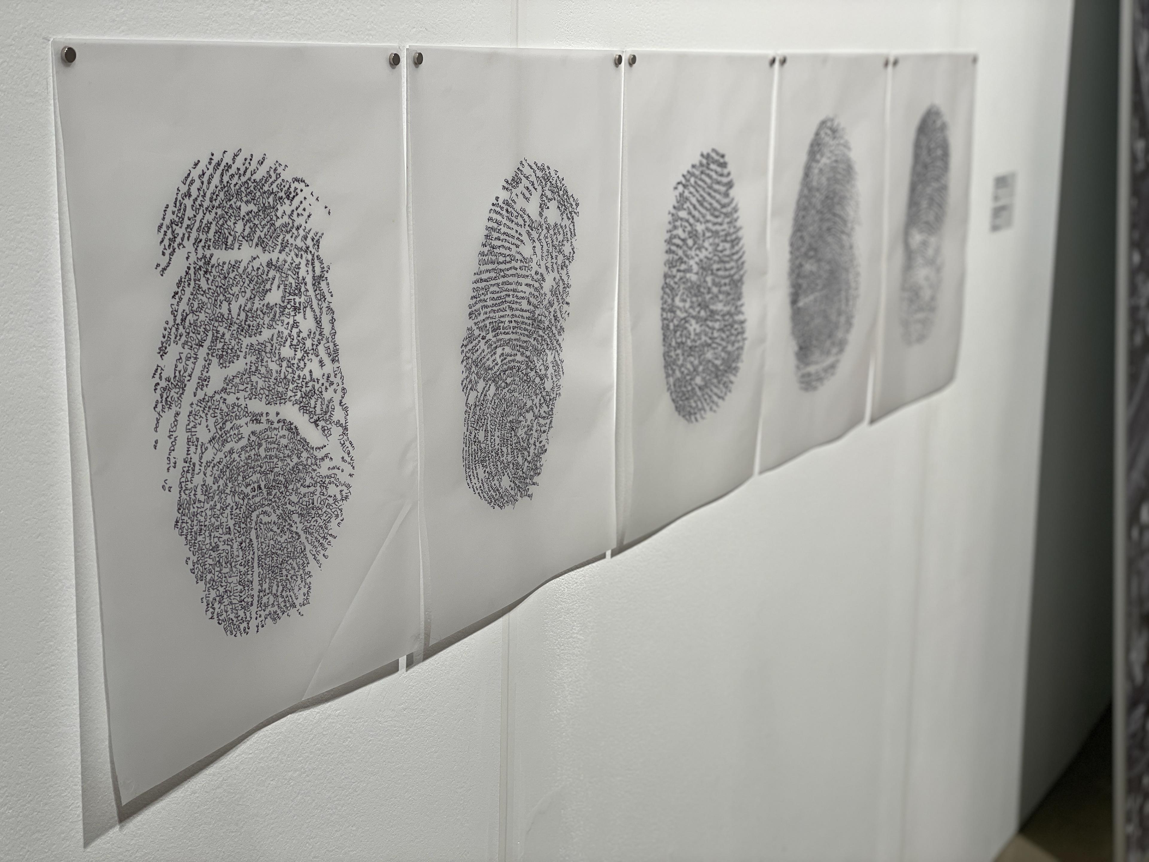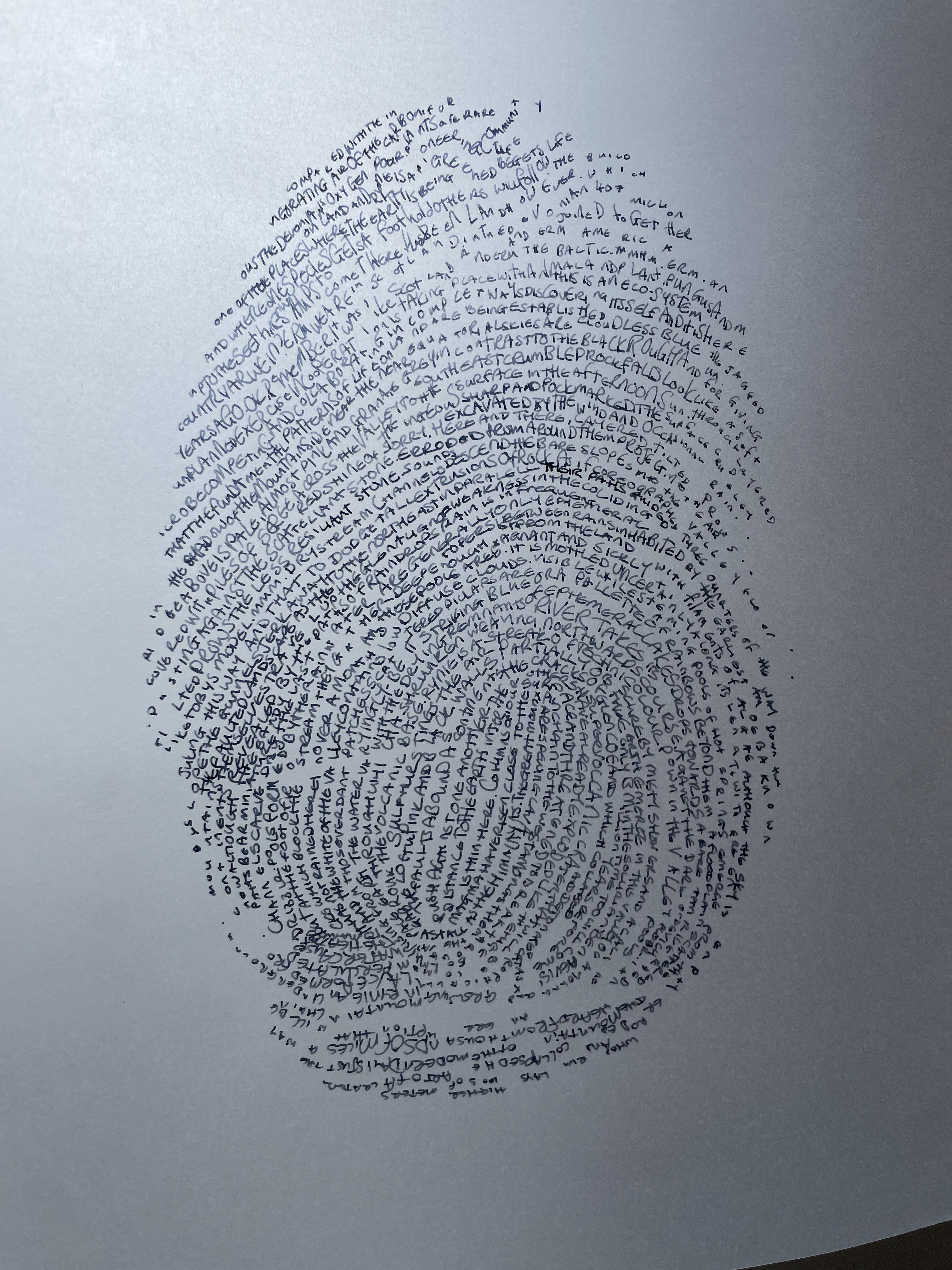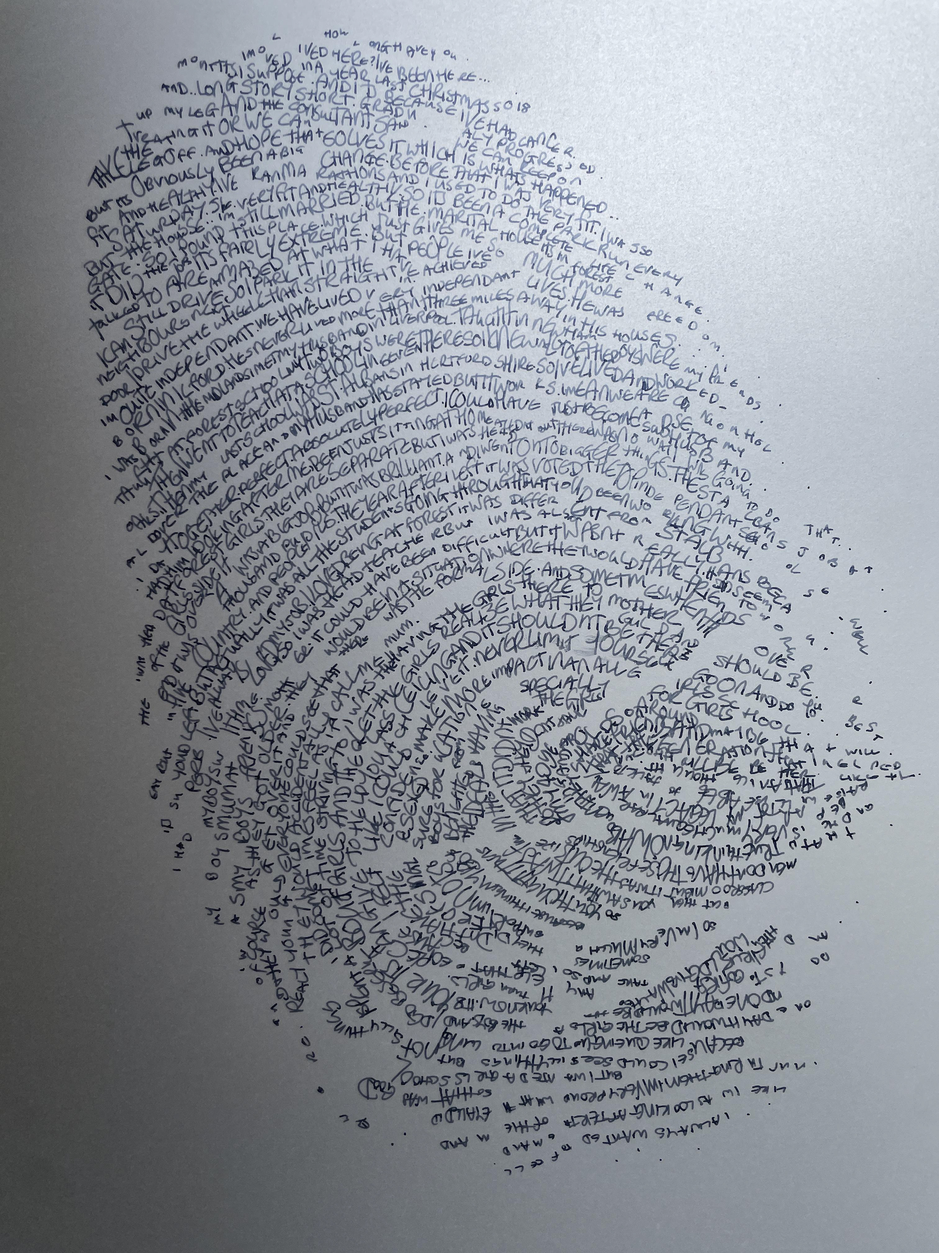 'Duologues' is a series of portraits of conversations between myself and other people. Some I know very well; some I have never met before. The index for me is my handwriting and the index for the other person is the pattern of their fingerprint. Each is unique.The interaction is depicted in the words of the conversation. They were recorded in the moment and transcribed later. They range in subject from holiday plans to one woman's life's work. They have no set starting point and are natural and flowing.They are purposefully unframed and drawn on tracing paper reflecting the fleeting connection between two people.The six drawings here are part of an ongoing series, if you would like to create a Duologue with me please do get in touch.