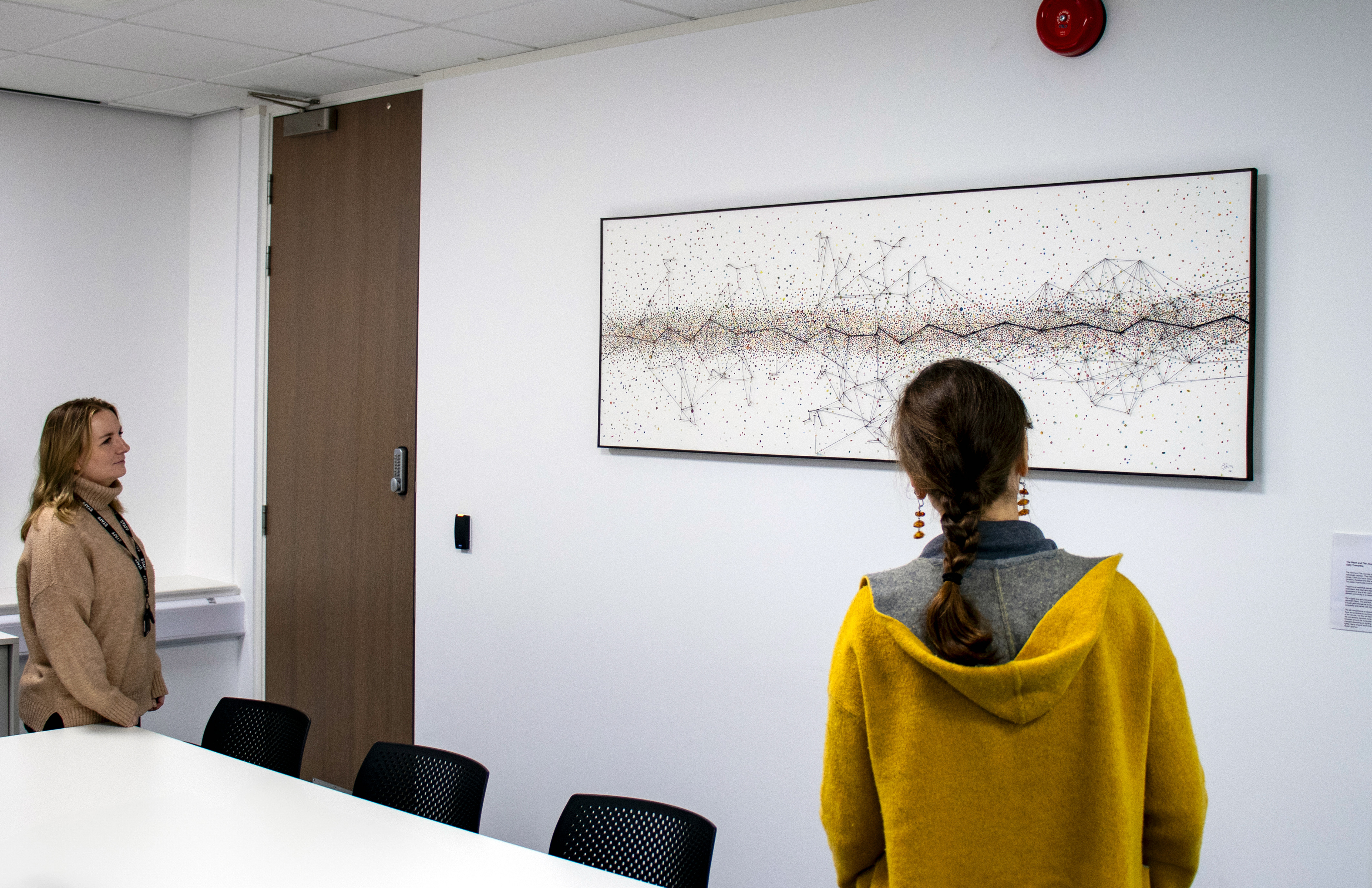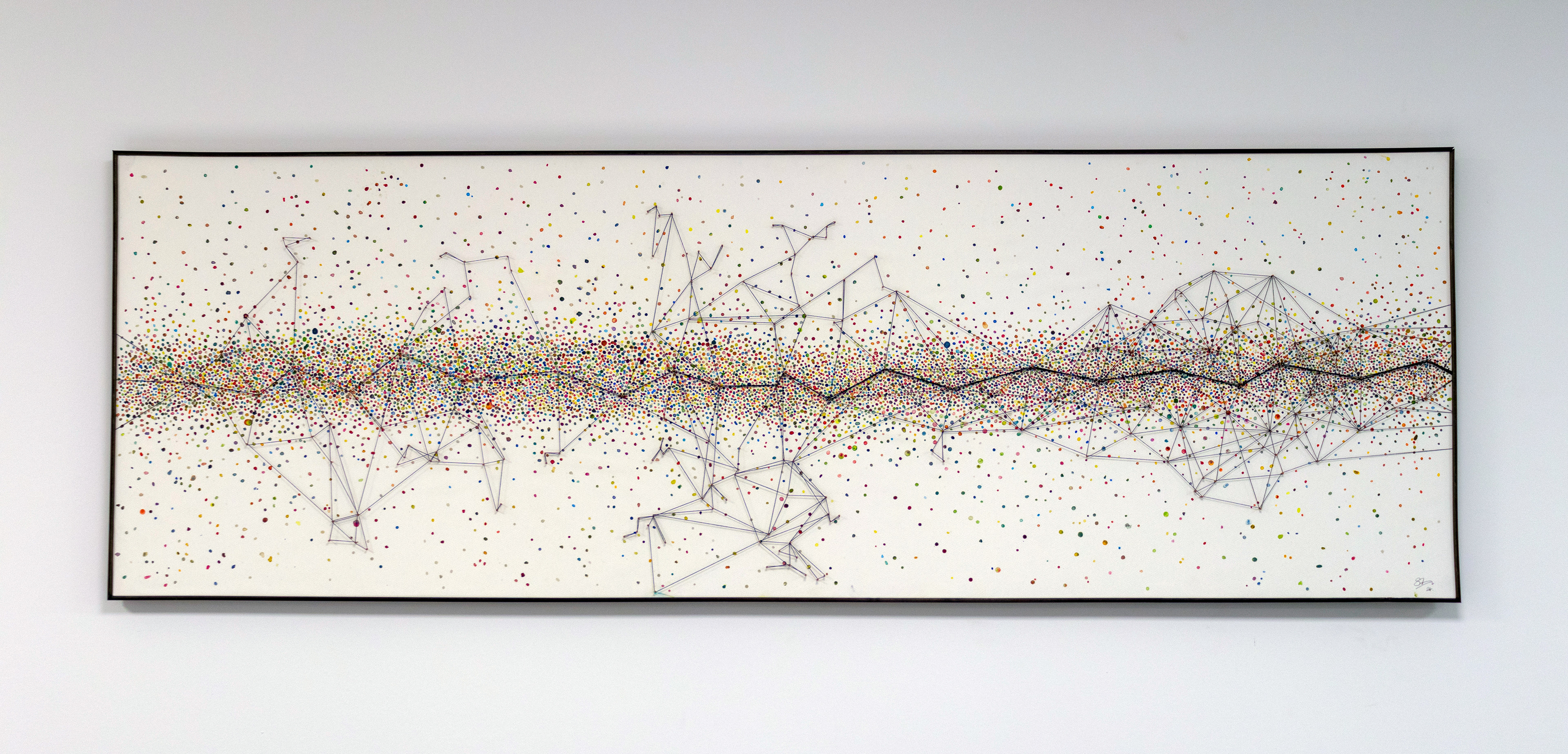 The silk thread forms a network of connections between the people involved with Healx. There are switchbacks and threads that do not lead anywhere, especially in the centre section of the canvas, but they all feed back to the horizontal line. Towards the right of the canvas the connections become more ordered and although the network is smaller, it is more focussed around the horizontal line. The threads cast a shadow on the paint surface which changes depending on lighting conditions, reminding us that things change and to tread lightly. Many threads leave the canvas on the right implying that there is much more to do on Healx's journey.