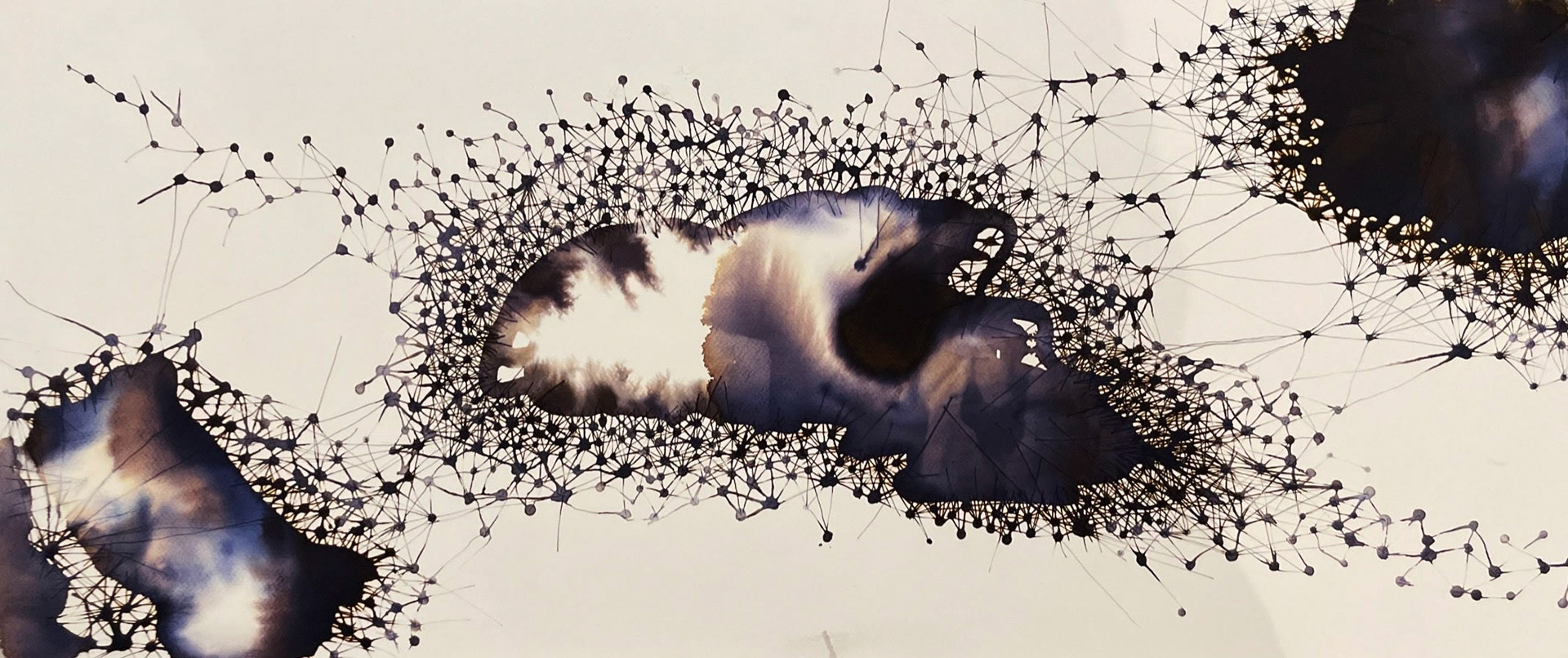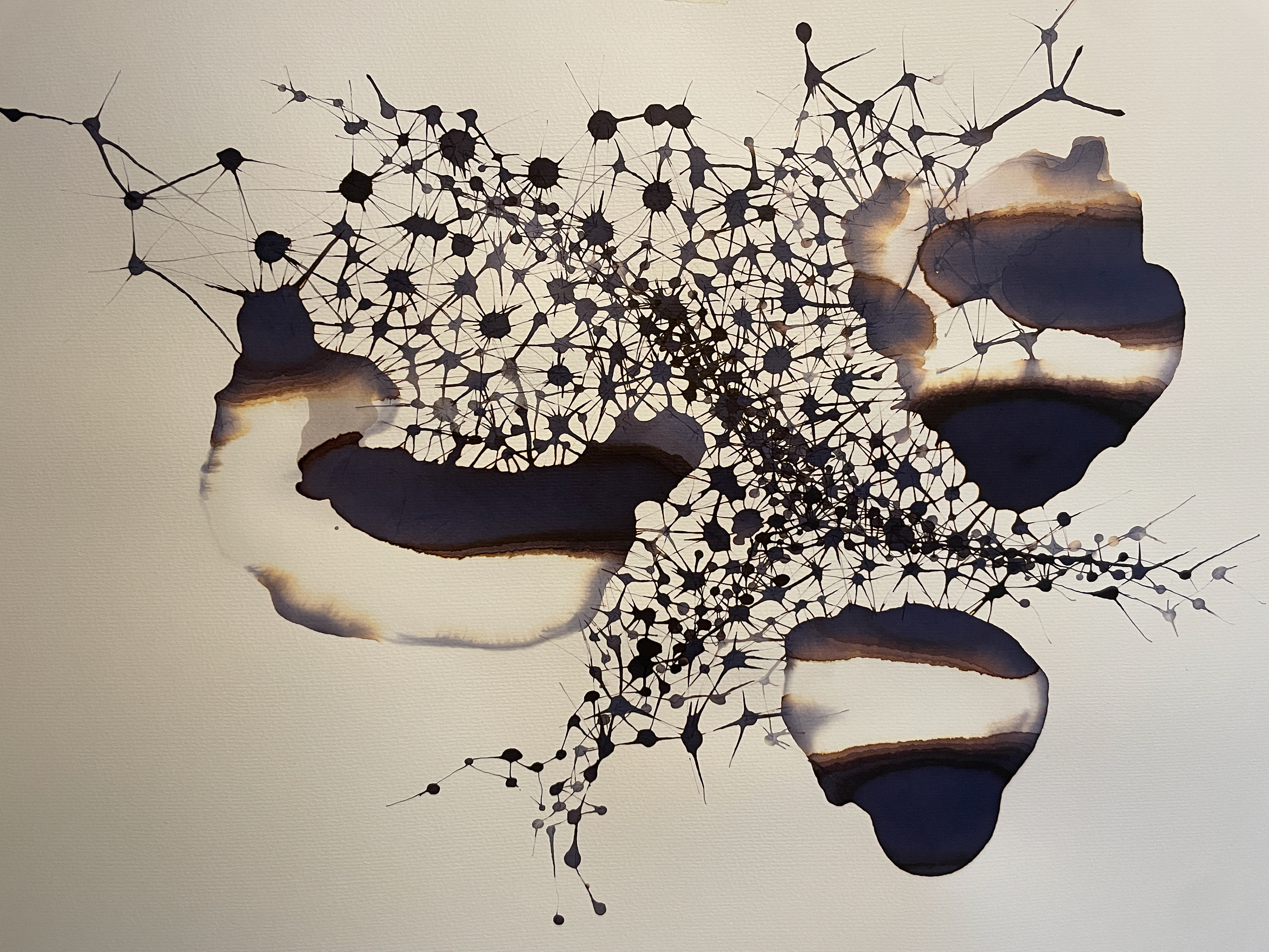 "I Am Because We Are" is a series of large scale ink drawings on watercolour paper. They use the unpredictability of water pools to break apart the pigments in the ink to show graduations of shade in ways that are inpredictable and impossible to replicate.
